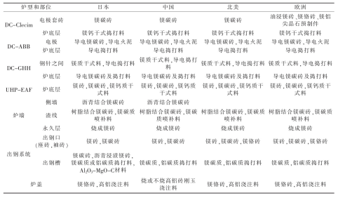 摘 要:由三根電極的普通交流電弧爐發(fā)展為超高功率(UHP)及一根電極的直流(DC)電弧爐,爐體結(jié)構(gòu)有一些改變。針對(duì)各部位的損毀因素,內(nèi)襯用的耐火材料也有所發(fā)展。例如普通電弧爐的爐頂用高鋁磚、爐墻鎂磚砌筑,而UHP及DC電弧爐采用大面積水冷爐頂、爐墻,爐頂三角區(qū)采用剛玉澆注料或預(yù)制件,爐墻用鎂碳磚,蝕損嚴(yán)重部位采用噴補(bǔ)作業(yè)。還介紹了日本等一些國(guó)家DC和UHP的各種爐型用耐火材料。煉鋼電弧爐是以電極端部和爐料之間發(fā)生的電弧為熱能進(jìn)行煉鋼的設(shè)備。電弧爐以廢鋼為爐料直接煉鋼,與礦石煉鐵后再煉鋼相比,基建投資少,節(jié)能60%、節(jié)水40%、減少?gòu)U氣排放86%、減少?gòu)U渣97%[1]。交流電弧爐歷史悠久,交流電是通過(guò)三根石墨電極輸入爐內(nèi),在電極下端與金屬料之間產(chǎn)生電弧,利用電弧高溫直接加熱爐料,使煉鋼過(guò)程得以進(jìn)行。供電功率越高,爐料熔化速度越快,降低能量消耗越多,因此出現(xiàn)超高功率(UHP)電弧爐。在超高功率的基礎(chǔ)上發(fā)展了直流(DC)電弧爐煉鋼。直流電弧爐是以一根石墨電極的端點(diǎn)為陰極,爐底為陽(yáng)極,石墨電極位于爐膛中心部位。與UHP相比設(shè)備結(jié)構(gòu)簡(jiǎn)單,建設(shè)費(fèi)用低,熔池中的電流與熱量分布比較均勻,不存在過(guò)熱區(qū)域,因此耐火材料損耗比較小、節(jié)能且噪音小等。目前,煉鋼電弧爐向大型化、控制自動(dòng)化方向發(fā)展。我國(guó)的電弧爐主要用來(lái)生產(chǎn)合金鋼。煉鋼水平與工業(yè)發(fā)達(dá)國(guó)家相比差距較大,如2015年我國(guó)電爐鋼占粗鋼總產(chǎn)量的6.1%,2020年有所提高,但也不超過(guò)10%,與世界平均水平的30%相比還有較大差距。我國(guó)已經(jīng)引進(jìn)先進(jìn)水平的UHP和DC電弧爐,隨著經(jīng)濟(jì)發(fā)展,工業(yè)化程度提高,必然伴以廢鋼資源數(shù)量增加,同時(shí)發(fā)展鐵礦石直接還原煉鐵技術(shù),代替廢鋼,增加電弧爐煉鋼的爐料,還有核電的發(fā)展,使電弧爐煉鋼有了物質(zhì)保證。電弧爐的內(nèi)襯是耐火材料構(gòu)成的,隨著UHP和DC技術(shù)的發(fā)展,需要新型優(yōu)質(zhì)耐火材料與之相配套。有人說(shuō)[2]:沒(méi)有優(yōu)質(zhì)爐襯、爐底耐火材料支持長(zhǎng)壽爐齡,超高功率電弧爐就無(wú)法發(fā)揮高效生產(chǎn)的優(yōu)勢(shì)。爐底耐火材料是直流電弧爐得以實(shí)現(xiàn)的必要條件,反映了煉鋼與耐火材料技術(shù)的互相影響,互為依存,在電弧爐煉鋼系統(tǒng)優(yōu)化生產(chǎn)中有不可分割的作用。1 電弧爐的結(jié)構(gòu)變化傳統(tǒng)的電弧爐由爐頂(又稱(chēng)爐蓋)、爐墻、爐坡、爐底和出鋼槽構(gòu)成,全部用耐火材料構(gòu)筑,外包鋼制爐殼。爐墻一側(cè)設(shè)有爐門(mén),另一側(cè)為出鋼口,并與出鋼槽相連。而UHP和DC電弧爐采用偏心爐底出鋼,使?fàn)t體由傾動(dòng)式改為固定式,爐底有供氣攪拌設(shè)置,爐頂安裝氧-燃料燒嘴,在爐底偏心位置設(shè)置出鋼口,代替出鋼槽。由于取消了傾動(dòng)設(shè)備,擴(kuò)大了水冷面積,緩和了爐襯的損毀,適當(dāng)降低了出鋼溫度,并縮短了出鋼時(shí)間,從而降低生產(chǎn)成本。爐墻采用鑲砌水冷箱式水冷套措施,其內(nèi)表面噴涂一層耐火涂料,使其掛渣形成保護(hù)層,可有效降低耐火材料消耗,但電耗可能增加。國(guó)外有的電弧爐功率達(dá)1 000 kV·A/t以上,爐墻壽命達(dá)2 000爐次以上,水冷爐蓋壽命達(dá)4 000爐次,降低耐火材料消耗60%以上。2 耐火材料內(nèi)襯的損毀因素電弧爐內(nèi)襯的耐火材料長(zhǎng)期處于高溫、熔渣侵蝕和急熱急冷狀態(tài)下,工作條件極其惡劣。在煉鋼的熔化期和氧化期,不致于因高溫?fù)p壞爐襯,但在還原期的鋼液溫度相當(dāng)高,又受電弧直接輻射(有時(shí)溫度達(dá)4 000℃以上),爐襯很容易造成熔融損壞。出完鋼裝料時(shí),爐襯溫度突然下降,裝完料開(kāi)始送電,溫度又逐漸升高,這種急冷急熱是爐襯剝落的直接原因,主要是爐頂容易剝落。耐火材料內(nèi)襯損毀的主要因素包括[3]:(1)化學(xué)侵蝕。FeO或渣中SiO2與耐火材料中的CaO、MgO之間的化學(xué)反應(yīng),使?fàn)t襯變?yōu)槿墼鴮?dǎo)致?lián)p毀。(2)耐火材料內(nèi)襯中的碳成分被含氧成分(如FeO、O2、MgO等)氧化,導(dǎo)致耐火材料脫碳而損毀。(3)沖刷和機(jī)械沖擊。鋼水或熔渣流過(guò)耐火材料表面,以物理性磨損或沖刷爐襯,而導(dǎo)致內(nèi)襯損毀;在出鋼口、渣線(xiàn)、電極口或排氣口平臺(tái)等沖刷嚴(yán)重,廢鋼等爐料吊入往往撞擊爐襯而損毀。(4)水化。在生產(chǎn)過(guò)程中,往往會(huì)出現(xiàn)爐頂或爐墻漏水或滲水,還有水蒸氣,與堿性耐火材料中的MgO、CaO進(jìn)行水化反應(yīng),使內(nèi)襯損毀。3 電弧爐用耐火材料根據(jù)電弧爐的結(jié)構(gòu),由于各部位承受的熱負(fù)荷大小不同,與熔渣、鋼水接觸作用及機(jī)械損壞程度存在差異,不同部位必須采用不同的耐火材料[4]。3.1 爐頂(蓋)我國(guó)中小電弧爐普遍采用燒成或不燒高鋁磚,局部用高鋁質(zhì)或剛玉質(zhì)不定形耐火材料預(yù)制件。大型超高功率電弧爐和直流電弧爐采用水冷技術(shù),除三角區(qū)外,爐頂耐火材料不是關(guān)鍵。三角區(qū)由于強(qiáng)烈